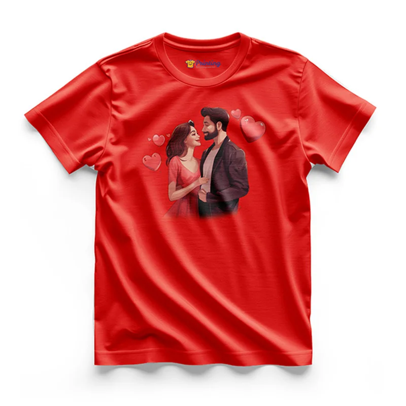 Celebrate your love in style with our Red Couple logo printed T-Shirts. It is  designed for couples who love to express their bond in a fun and fashionable way.  Made from premium soft cotton fabric, these t-shirts offer all day comfort while keeping your look trendy and eye catching. The romantic matching design perfectly complements both partners, creating a coordinated and stylish appearance. The vibrant red color symbolizes love and passion, making it the perfect choice for couples who want to stand out and show their connection. Pair them with jeans or casual wear and create unforgettable memories together.